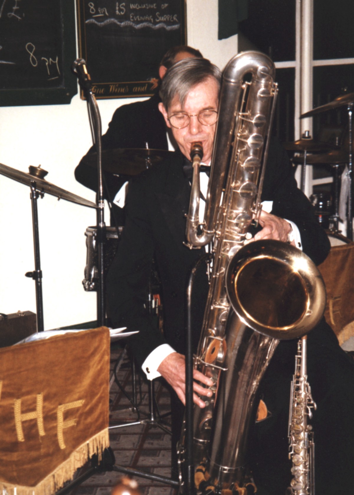 Born 1937 in Kingston, London, moved to Eastbourne spent early life there, moved to Brighton about 1970. First instrument was harmonica, became fairly proficient, still own a few. Took up clarinet approx. 1953 (after 3 months, was told "if you press this little key at the back, you get a whole load of different notes, but higher") and suddenly found I had an upper register as well! (Albert system) changed to Boehm system 1955, studied recordings of Johnny Dodds, Jimmy Noone, Barney Bigard etc. gave up clarinet - took up banjo - after 6 months, gave up banjo. And so back to clarinet. Started to learn chords on spanish guitar, added alto-sax approx. 1962. 1955-1960 in Royal Air Force - 'Mike King's Jazz Band' - Germany, (started collecting 78rpm jazz/ragtime records and windup gramophones) first band - 1961 'The Original Mojo Rhythm Kings' played regularly at the 'Dewdrop' Inn, South St. Eastbourne. Did 'Tiger Rag' with the band for TV talent contest, think it was the TV company at Portsmouth or around there,(forget the actual name). 'Eagle Jazzband' - also in Eastbourne. - bought a baritone sax - many excursions to Hastings to hear (and hope to sit in with) the excellent Dolphin Jazz Band performing at the Market Hall, George St. A founder member of 'Expedient Marching Band'. The line-up was: Pete Treger cnt, Pete Kitcher tpt, Tony Pike clt, myself alto, Ted Owen Eb clt, Johnny Griffiths Eb horn, Tex ? tbn, Derek ? tbn, John Boyatt sousa, Peter Davies snare drm, Alan Whitmore Bass drm, Roy Martin flag bearer. 'Five Jazz Hounds' with Pete Treger cnt, John Collinson pno, myself alto, John Griffiths bass, Alan Whitmore dms, sometimes with Bill Cole sousa, Tony Pyke clt, Mike Pointon tmb. Played with the 'Jazz Caverners' (founded by Brian Towers of the now disbanded Dolphin Jazz Band )with Pete Kitcher on Cnt. 1962 'Indiana Jazz Orchestra' with 'Megs' (Mike Etherington) on Cnt. recorded an EP - (Tuxedo Rag/Gone Daddy Blues/Forty & Tight/She's Forty With Me). First professional band: on the road full time with 1963 'Original Downtown Syncopators' replacing Bob Gordon-Walker, who was about to disappear to work in the States. The lineup was : Dave Davies cnt, Barry Dunning tmb, myself clt/alt, Ron Geesin pno, Geoff Daley dms. I have Ron to thank for suggesting me as a replacement for Bob, and I was delighted of course. This five piece band attempted to emulate the Original Dixieland Jazz Band with good success, and travelled about in a delapidated Bedford bus (a real piece of art deco!), complete with fitted beds,band uniform wardrobe,calor gas heating, kitchen sink, mickey mouse wallpaper,the lot! Ron Geesin's bed was above the water tank,and I can remember the green mold on his pillow! We regularly had to brush rust flakes from our bedsheets which fell from the roof! And - we had a flea epidemic and had to destroy all the bedding. One night, having completed a gig in Manchester, we drove in a really thick pea-souper fog trying to find a car park - and eventually found what we thought was ideal, and divested ourselves of our band uniforms (dj's) and bedded down for the night. In the morning we were awakened by the sound of terrible banging on the side of the bus! Pulling back the curtains, we found had parked in an open square, and a grand parade was starting up, complete with bagpipes, horses, sea cadets, and allsorts. The police wanted us to move our wreck of a bus elsewhere, obviously. So we drove away, still in our pyjamas, through the thronged crowds and shopping centres. In Crawley, met Billy Jones, the pianist who played with the Original Dixieland Jazz Band when they came to England in 1920. As far as I remember, Billy Jones was in Crawley to take part in a Pathe Pictorial film about the Original Dixieland Jazz Band and featuring a performance of the ODS. This was just prior to my joining the band. 1964 - Joined 'Spencers Washboard Kings', did radio broadcasts, recorded singles on Rayrick,Parlophone, and Polydor labels plus an LP on 'Davjon' label. Carl Spencer took over outstanding gigs from the now disbanded Original Downtown Syncopators.1965 - A typical gig was Saturday 6th - Eel Pie Island - supporting Monty Sunshine Band. Pay for this was £8.00 at this time. [About this time I visited a music shop in Eastbourne, run by Addie Norris, called the 'Ocklynge Music Shop', in which one could find all manner of second-hand instruments. In fact my first clarinet was bought here, an Albert system for nine pounds, the trumpet I was after was ten pounds at the time, for the sake of a pound I may have become a trumpet player! Anyway, just as I was about to leave I noticed a small jar near the door containing some small flutes and/or fifes. Sorting through produced what could only be a 'Hot Fountain Pen', inscribed Keith Prowse Ltd, London, complete with mouthpiece and single screw ligature! What a find! Would you believe it, it was left in a tenor sax case which was lost en route to a London gig!dammit! (update - 2008 - found another, and a 'goofus' !) Much touring in Denmark,Sweden,Germany and Belgium followed. Met Ben Webster in Copenhagen, (along with his manager) at the 'WineGarden' jazzclub. We were performing 'Dicty Blues' at the time, with myself doing the Coleman Hawkins tenor solo, when Carl Spencer prodded me and said in my ear - "Ben Webster has just walked in!" - (that gave me the jitters!) In the interval we descended on Ben and were treated to a few tales of being on the road with the Fletcher Henderson band in the thirties. One tale I remember -(Ben W.) "We were in a hurry to get to the next town - travelling in the band coach. I was sitting next to Kaiser Marshall, the driver shouted - "The brakes have gone!", someone else shouted "Turn the bus on it's side!, Kaiser Marshall shouted "Oh! shit - Oh! shit", and we all dived on the floor!". Champion Jack Dupree in Brussels (Pol's Bar) sitting in with the Washboard Kings, and at the '100 Club' in Oxford street, London. Both Acker B